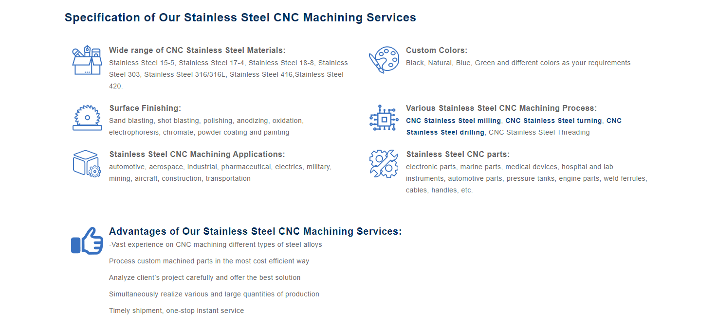If you are seeking a professional CNC machining supplier to provide high quality precision CNC machined Stainless Steel parts, CNCLATCHING is one of the most affordable and capable manufacturer, specializing in Stainless Steel CNC Machining process on advanced 3-axis and 5-axis Steel CNC machines. Our professional technical team has in-depth understanding of special Stainless Steel CNC machining requirements (especially custom CNC steel turning, CNC steel milling, CNC steel drilling, steel prototyping) and other than the aluminum parts, and state-of-the art facility has helped us achieve this distinction. With great experience and broad knowledge, our CNC Stainless Steel machining center can reach extremely tight tolerances in manufacturing CNC steel machined parts & products.